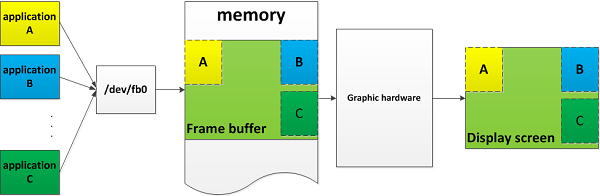 3个application 通过fb0这个fb device 节点对framebuffer进行修改,然后由图形硬件将修改之后的内容输出到显示端
