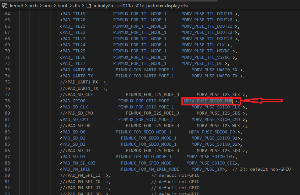 kernel里控制sd power 的gpio,其实是根据padmux里的MDRV_PUSE_SDIO0_PWR来找到对应哪个gpio口的,dts里的slot-pwr-gpios在padmux存在情况下,是没有作用的。