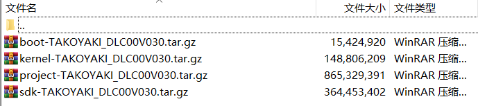 tar zxvf project-TAKOYAKI_DLC00V030.tar.gz tar zxvf boot-TAKOYAKI_DLC00V030.tar.gz tar zxvf kernel-TAKOYAKI_DLC00V030.tar.gz tar zxvf sdk-TAKOYAKI_DLC00V030.tar.gz