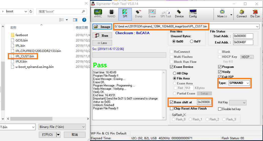 烧录SPINAND的方法和SPINOR一样,只是地址以及文件稍有差别。