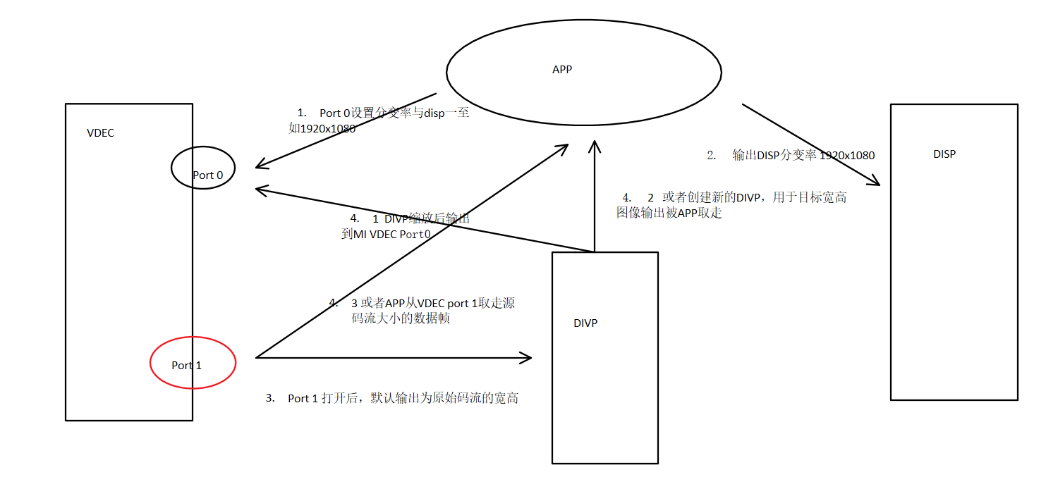 从port1解码后的数据帧分两条路线走,要么给APP抓图拿走,要么从MI DIVP内部抓取给VDEC port0,再通过port0给到MI DISP。如下图