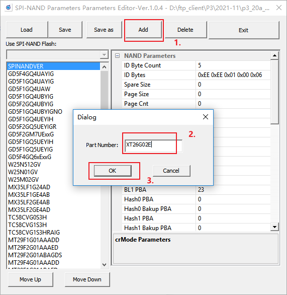 点击“add”按钮,输入Flash型号,点击“OK”新增空白的配置,操作步骤如图3-1所示: