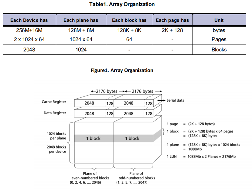 如图3-4和图3-5所示,XT26G02E的页大小(Page Size)为2048字节,每一个块(Block)包含64个页(Page),每一页除2048字节有效数据外,还包含128字节空数据区域(Spare Size)。Plane数目为2,总的块数量为2048个。