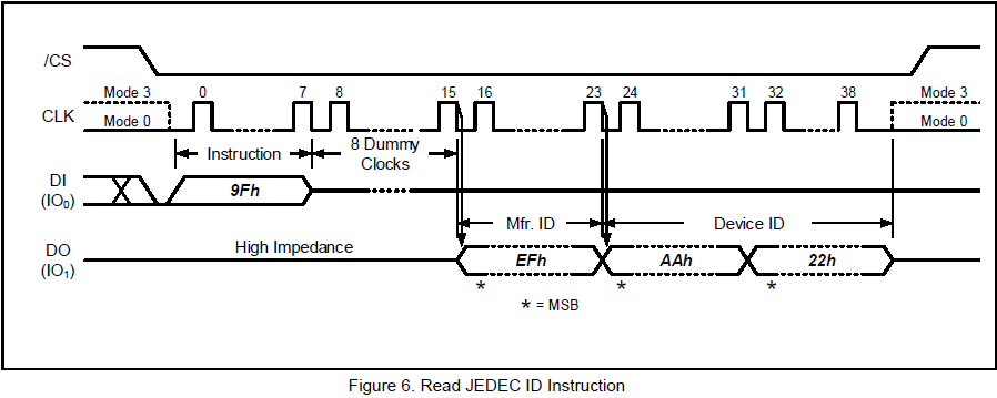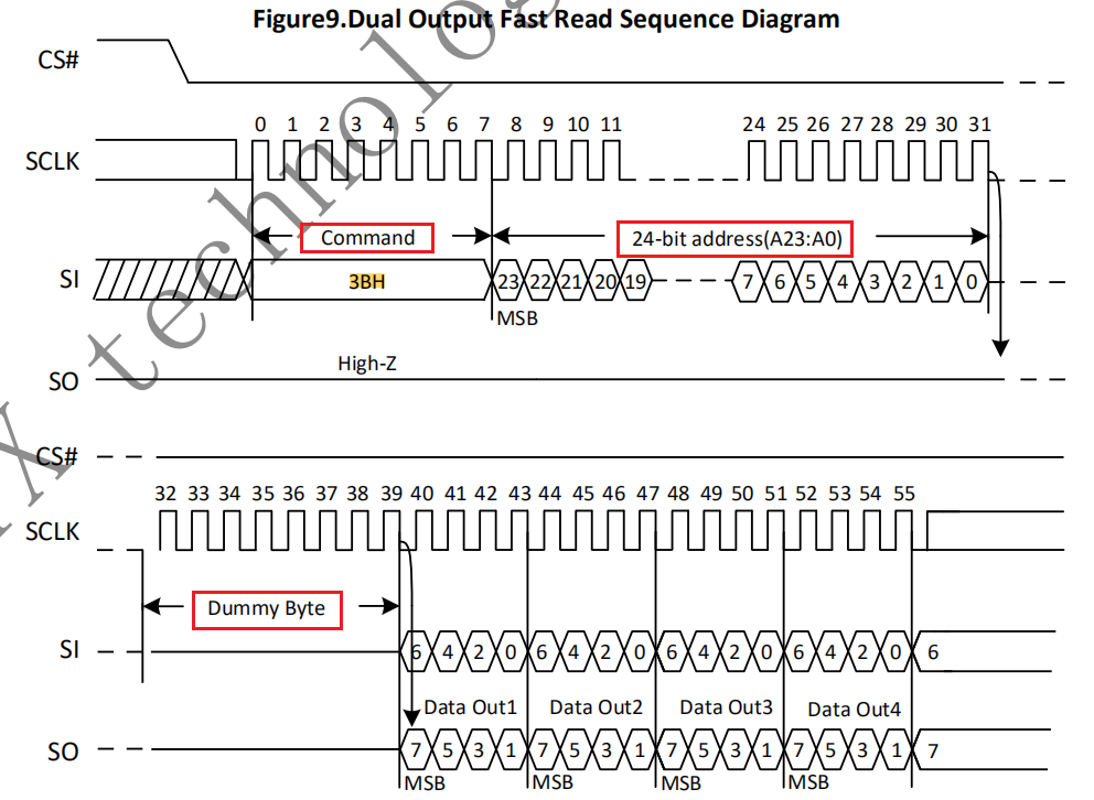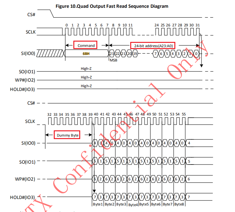 - 读时序为:0x6B + 3byte address + 8 Dummy Cycles + data