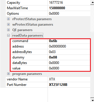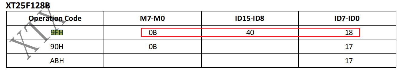 如图10-2所示,XT25F128B的ID为两字节0x0B 0x40 0x18三个字节:
