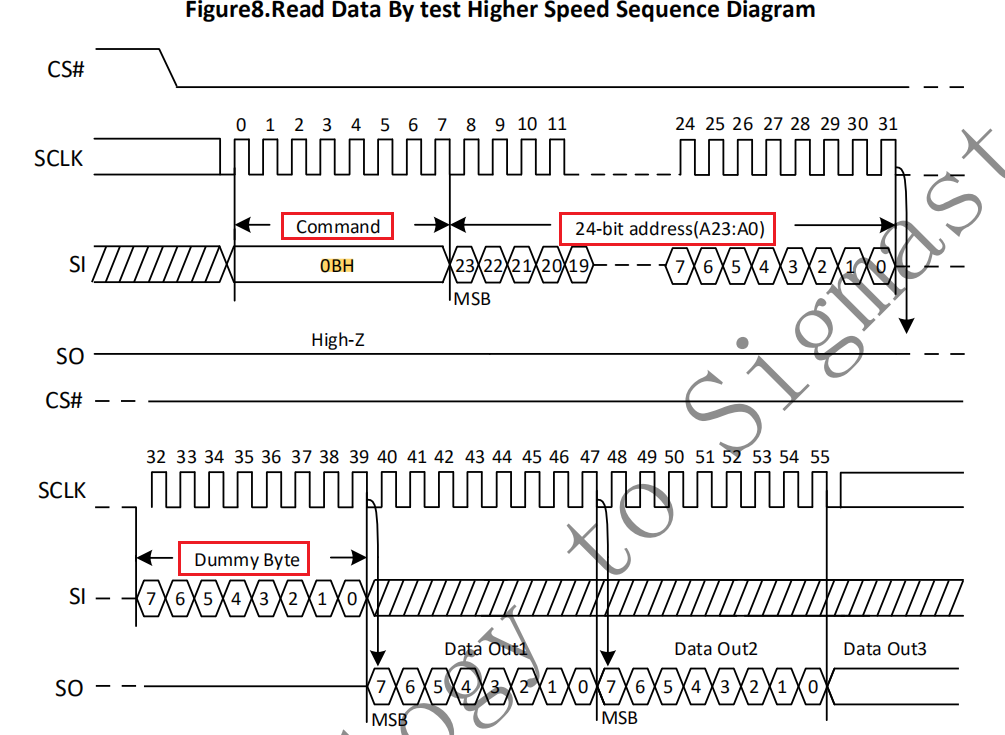 - 读时序为:0x0B + 3byte address + 8 Dummy Cycles + data