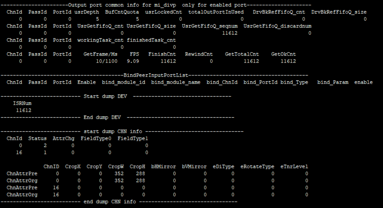 | 举例 | echo statintervaltime 0 ON > /proc/mi_modules/mi_divp/mi_divp0 [MI DIVP PROCFS]:ChnlID 0,1s FrameCnt:19,Average time: 50393 us,MAX 59601 us,57652 us,57534 us,MIN 41401 us,42415 us,42896 us [MI DIVP PROCFS]:ChnlID 0,1s FrameCnt:19,Average time: 50247 us,MAX 63004 us,62889 us,62845 us,MIN 36896 us,37120 us,37130 us [MI DIVP PROCFS]:ChnlID 0,1s FrameCnt:18,Average time: 51049 us,MAX 70431 us,59763 us,59736 us,MIN 38873 us,40109 us,40283 us [MI DIVP PROCFS]:ChnlID 0,1s FrameCnt:20,Average time: 48537 us,MAX 67168 us,67117 us,66953 us,MIN 18513 us,31242 us,32681 us [MI DIVP PROCFS]:ChnlID 0,1s FrameCnt:19,Average time: 49962 us,MAX 61416 us,61416 us,61338 us,MIN 38564 us,38736 us,38762 us FrameCnt: 1秒时间GetBuffer的数量 Average time: 拿到两个buffer之间间隔时间的平均时间 MAX:间隔时间最大的三个值。 MIN: 间隔时间最小的三个值 |