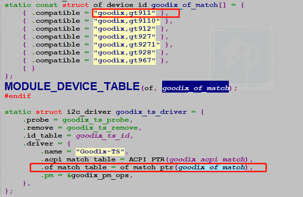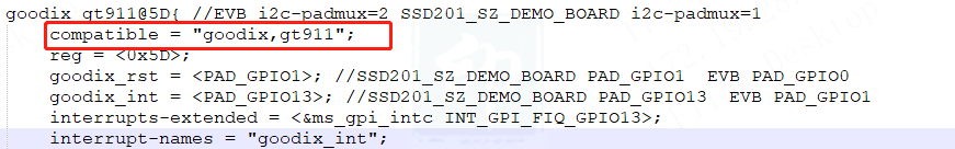 According to the hardware connection of the device tree node, configure the pins corresponding to the two attributes of goodix_rst/goodix_int (the attribute name needs to match the driver PAD_GPIO1/PAD_GPIO13 (it needs to match the actual hardware), and the reg configuration is the touch I2C