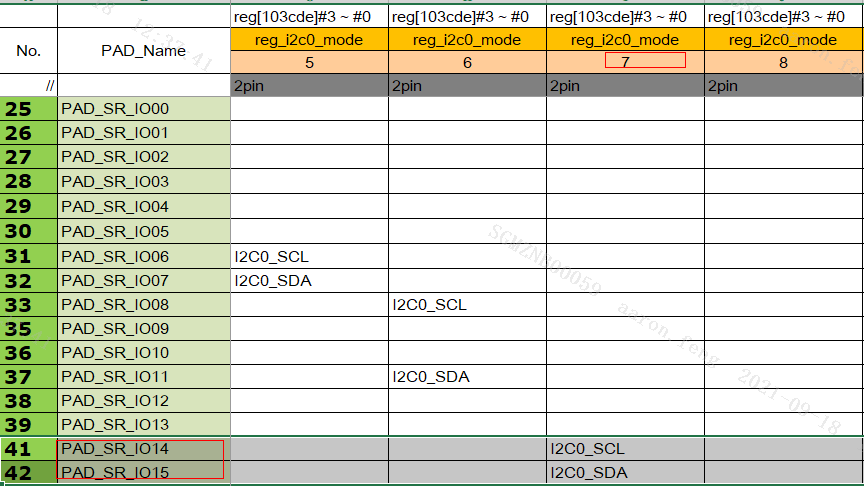 1. //i2c0_mode_11 2. <PAD_SR_IO14 PINMUX_FOR_I2C0_MODE_7 MDRV_PUSE_I2C0_SCL>, 3. <PAD_SR_IO15 PINMUX_FOR_I2C0_MODE_7 MDRV_PUSE_I2C0_SDA>,