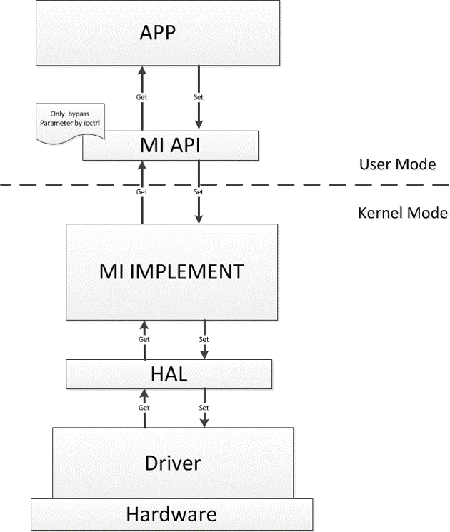 For the User Mode interface of the MI API provided by the upper-level client, the user-level APP directly calls the MI interface to call the corresponding MI function.