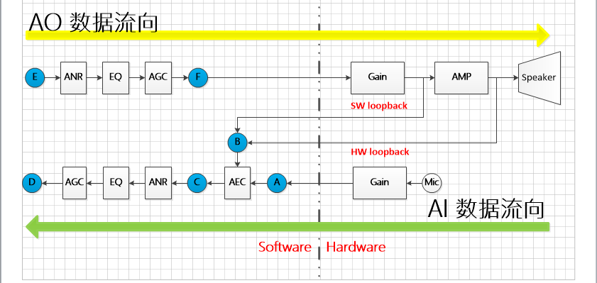 Microphone data collection ——> Chip internal gain ——> MI layer (A) where the data is the original PCM number ——>sent to the AEC algorithm for processing with data from AO (B) ——> The processed data arrives at C ——> sent it to the APC (which is the collection of ANR, EQ, HPF and AGC) for processing ——>The final data arrives at D