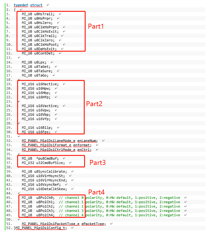 Parameters Description m_wHsTrail Default: 5 m_wHsPrpr Default: 3 m_wHsZero Default: 5 m_wClkHsPrpr Default: 10 m_wClkHsExit Default: 14 m_wClkTrail Default: 3 m_wClkZero Default: 12 m_wClkHsPost Default: 10 m_wDaHsExit Default: 5 m_wContDet Default:0 m_wLpx Default:16 m_wTaGet Default:26 m_wTaSure Default:24 m_wTaGo Default:50 m_wHactive Follow Panel parameter setting m_wHpw Follow Panel parameter setting m_wHbp Follow Panel parameter setting m_wHfp Follow Panel parameter setting m_wVactive Follow Panel parameter setting m_wVpw Follow Panel parameter setting m_wVbp Follow Panel parameter setting m_wVfp Follow Panel parameter setting m_wBllp 0 m_wFps Default:60 m_eLaneNum one lane :1 two lane :2 three lane :3 four lane :4 m_eFormat RGB565 :0 RGB666 :1 LOOSELY_RGB666 :2 RGB888 :3 m_eCtrlMode CMD_MODE :0 SYNC_PULSE :1 SYNC_EVENT :2 BURST_MODE :3 m_ucClkLane Clk lane selection(default:2) 0:select chn0 1:select chn1 2:select chn2 3:select chn3 4:select chn4 m_ucDataLane0 data lane0 selection(default:4) 0:select chn0 1:select chn1 2:select chn2 3:select chn3 4:select chn4 m_ucDataLane1 data lane1 selection(default:3) 0:select chn0 1:select chn1 2:select chn2 3:select chn3 4:select chn4 m_ucDataLane2 data lane2 selection(default:1) 0:select chn0 1:select chn1 2:select chn2 3:select chn3 4:select chn4 m_ucDataLane3 data lane3 selection(default:0) 0:select chn0 1:select chn1 2:select chn2 3:select chn3 4:select chn4 m_pCmdBuff Mipi panel cmd m_pCmdBuff= m_ucPolCh0 Chn0极性 0:default 1:positive 2:negative m_ucPolCh1 Chn1极性 0:default 1:positive 2:negative m_ucPolCh2 Chn2 polarity 0: default 1: positive 2: negative m_ucPolCh3 Chn3 polarity 0: default 1: positive 2: negative m_ucPolCh4 Chn4 polarity 0: default 1: positive 2: negative -
