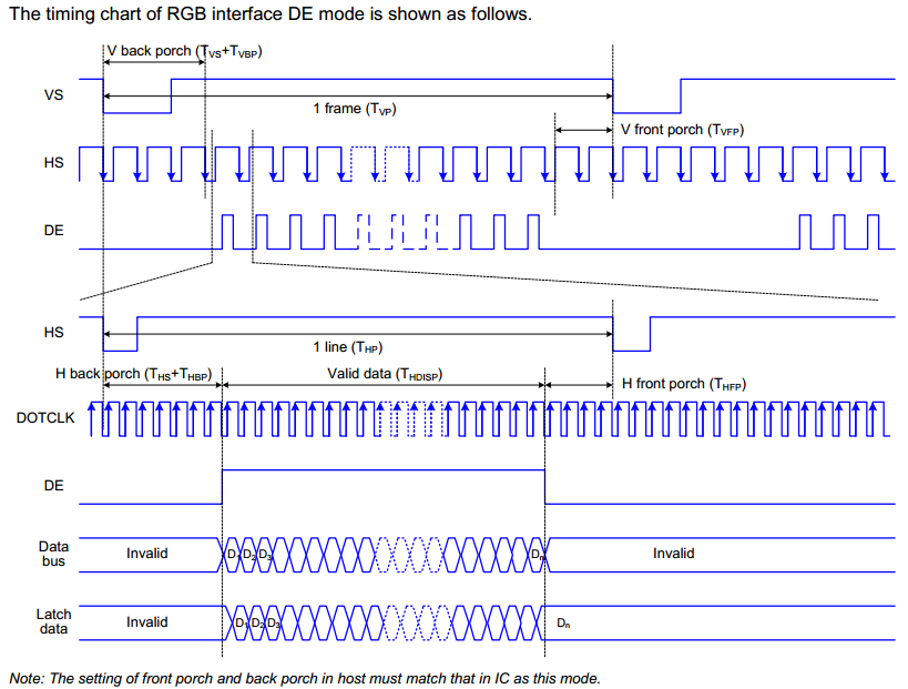 Panels using Parallel RGB Interface require HSYNC, VSYNC, and DOTCLK as synchronization signals, and RGB data is only valid in a specific interval of timing.