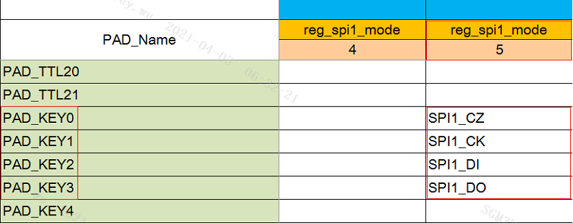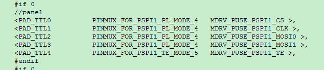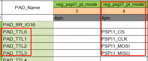 Query the HW Checklist table to find the multiplexing mode corresponding to the pin. In the following example, configure PAD_TTL0~PAD_TTL3 as PSPI1_PL_MODE_4, and configure PAD_TTL4 as PSPI1_TE_MODE_5.