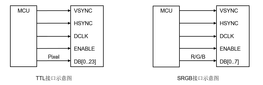 The TTL interface signal type is TTL level, the content of the signal is RGB565 or RGB666 or RGB888, horizontal and vertical synchronization (HSYNC/VSYNC), clock (CLK) and data valid signal (DE).