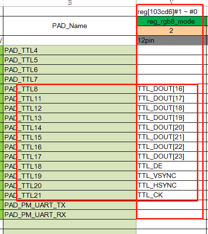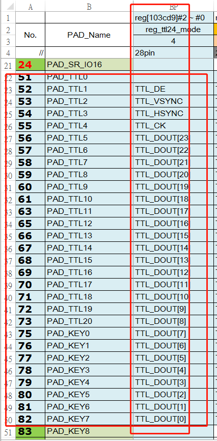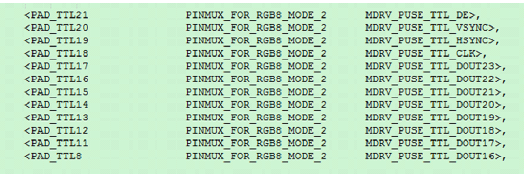 It can be seen from the above that the panel uses ttl24_mode_4, and pioneer3-ssc020a-s01a-demo-camera-padmux.dtsi corresponding to the kernel (the corresponding padmux.dtsi is different if the config used is different) is configured as follows: