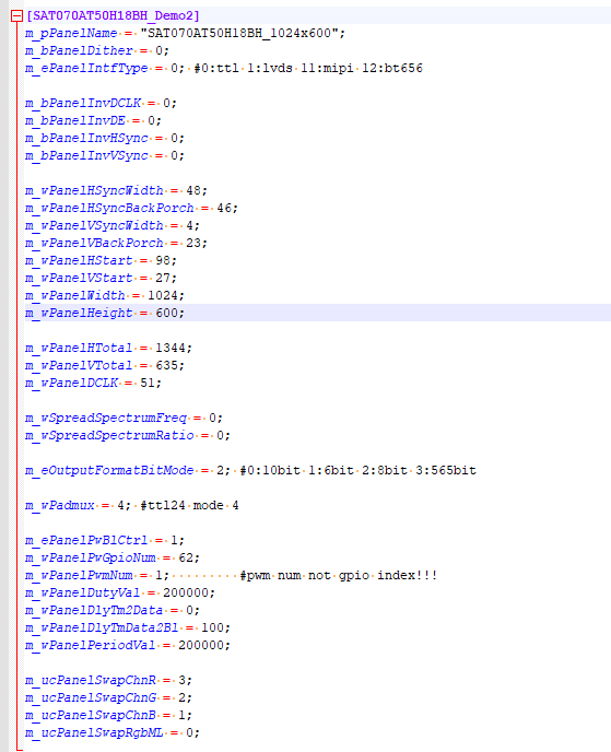 | m_ePanelPwBlCtrl = 1; | Indicates whether to control the timing of pwm and power in config. 0: Disable the following configuration. 1: Enable the following configuration. |