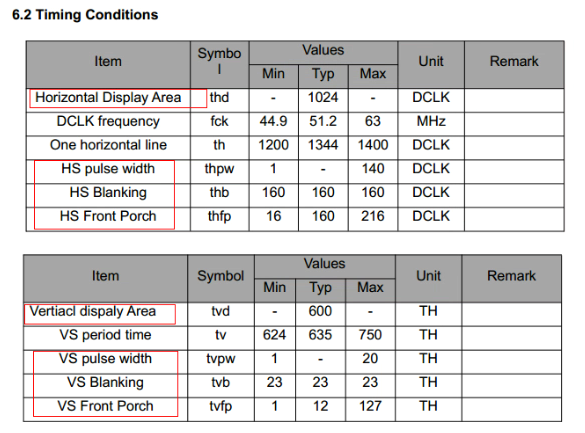 The configuration related to the timing in the Panel parameters is mainly to adjust HSYNC, HBP, HFP in the line signal and VSYNC, VBP, VFP in the field signal. The length requirements of each part of the blanking interval will be provided in the panel spec.