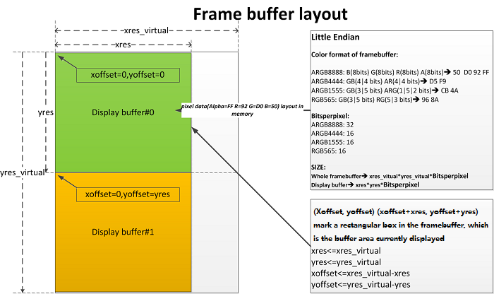 (xoffset,yoffset) (xoffset+xres,yoffset+yres) marks a rectangular box in the framebuffer, which is the buffer area currently displayed. That is to say, the effective area of the display buffer for display can start from the start address of the framebuffer.