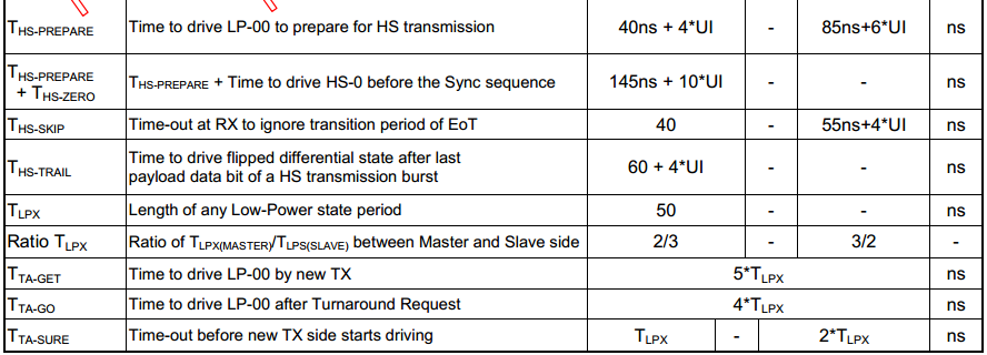 For example: 40ns+4 \times UI < HS-PREPARE < 85ns+6\times UI , the corresponding parameters in MIPI AC timing are as follows.