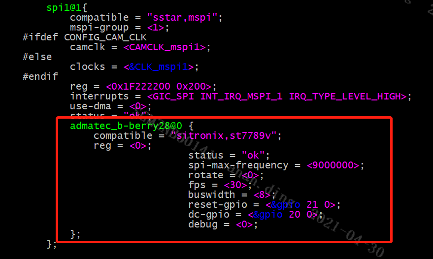 insmod /config/modules/4.9.84/fbtft_device.ko busnum=1 name=admatec_c-berry28 cs=0 gpios="reset:21,dc:20" custom=1 speed=40000000 width=240 height=320 buswidth=8 mode=0 debug=7 dma=0