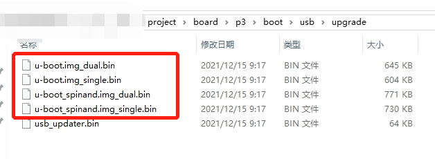Replace the compiled u-boot_spinand.img.bin or u-boot.img.bin with the corresponding bin file under /project/board/p3/boot/usb/upgrade (only used for empty boot).