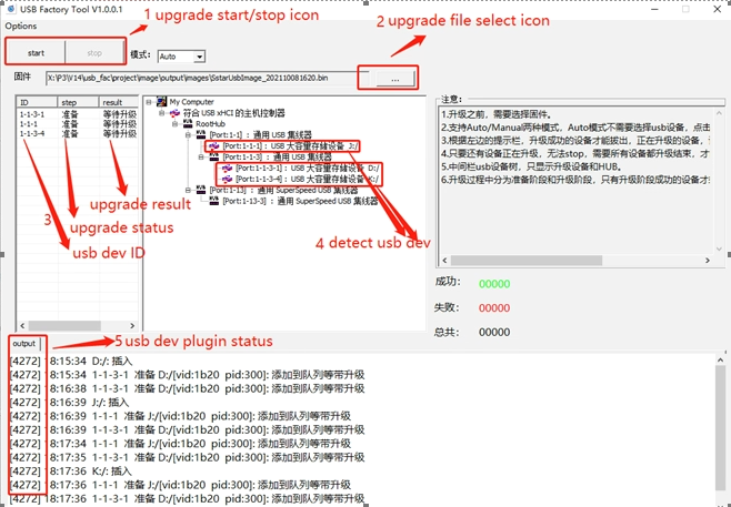 3→USB device upgrade status and result display column, it should be noted that there are currently two statuses for blank flash upgrade: preparation and upgrade. You must wait for the upgrade status to succeed before unplugging the usb device and inserting another usb device to upgrade;