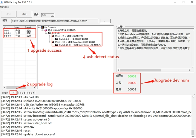 Select the usb upgrade package file. After all the plugged devices are recognized, click the start button to upgrade. The interface after the upgrade is completed is as follows: