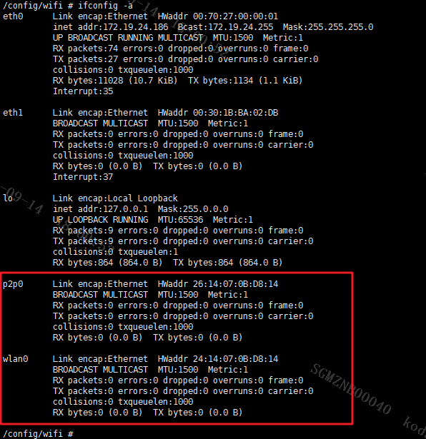First insmod loads the WIFI driver, take ssw101b as an example, the corresponding driver is ssw101b_wifi_HT40_usb.ko. Run insmod ssw101b_wifi_HT40_usb.ko, use ifconfig -a to view, you can see the newly generated wlan0 node and p2p0 node: