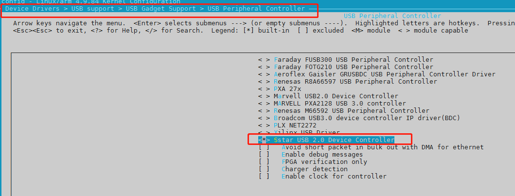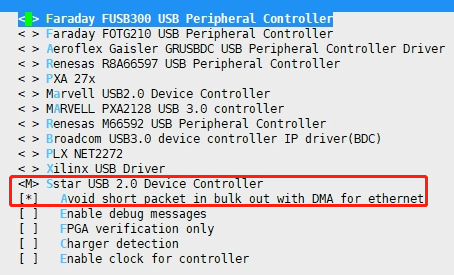-> Device Drivers -> USB support -> USB Gadget Support -> USB Peripheral Controller -> Sstar USB 2.0 Device Controller