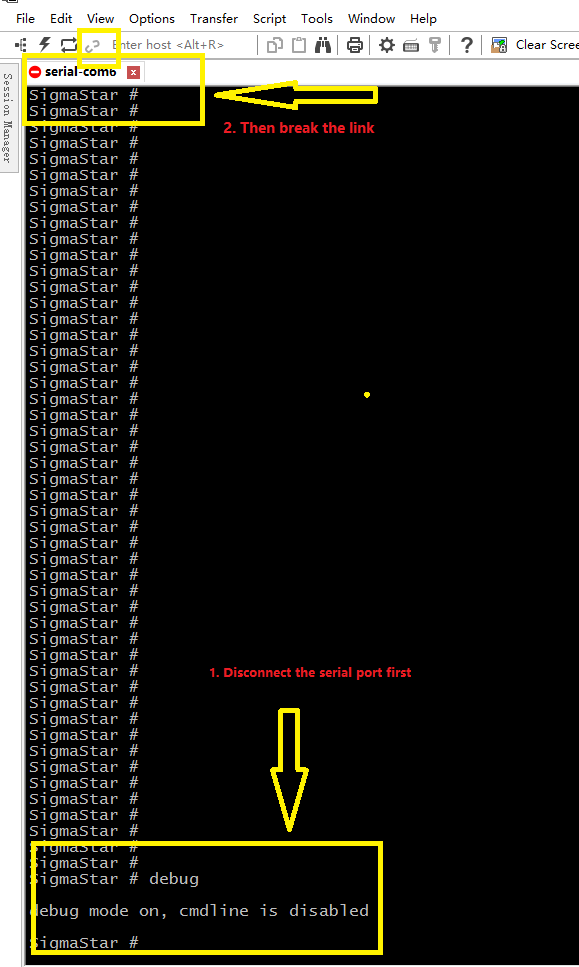 Power off the board, then power on and enter the boot interface and enter "debug" to close the serial port and disconnect the serial port connection software.