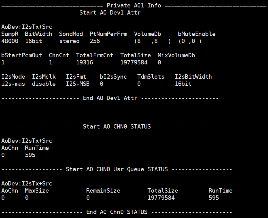 0: 6 wire mode,RX and TX has its own clockTdmSlots I2S Tx TDM slot count(only for I2S Tx) I2sBitWidth I2S Tx bit width(only for I2S Tx, and the chip must support TDM) AO Chn Status AoDev AO device name AoChn AO channel number RunTime Enable time of the AO channel(S) AO Chn Usr Queue Status AoDev AO device name AoChn AO channel number MaxSize AO channel Queue size(byte) RemainSize The current amount of data size of AO channel Queue TotalSize APP send to AO channel data size(byte) RunTime Enable time of the AO channel(S)