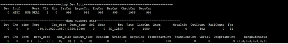 Parameter Description Dev Attr u32VifDevIdx Dev ID Intf Protocol for entering data Clk Runmode Hdr Hdr type IsrCnt Frame start callback count yncCnt/EnqCnt/ BarCnt/CheckCnt/ DequCnt Callback interface execution times OutPort Attr Chn Channel id Pipe Pipe id Port Port id Cap_size input size Dest_size output size Sel Frame selection Scan Scan mode, progressive or interlaced Fmt Output pixel format Rate Frame rate type LineCnt Frame mode line count Atom The number of buffers held by the bottom layer MetaInfo Frame id Outcount Output frame count Failcount Failed to get outputbuffer count Fps Frame per second Recv_size Vif hardware received size Out_size Write dma size SubOut_size Write sub dma size ReadIdx/WriteIdx/ DequeIdx Read,write,deque 的 index FrameStartCnt Which frame is processed to FrameDoneCnt How many frames are processed VbFail VbFail count DropFrameCnt Drop frame count RingBufStatus Ring buf status