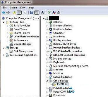 右键点击桌面“计算机”图标,选择“管理”——“设备管理”,可以看到“RNDIS Kitl”设备,并且处于驱动未安装状态。