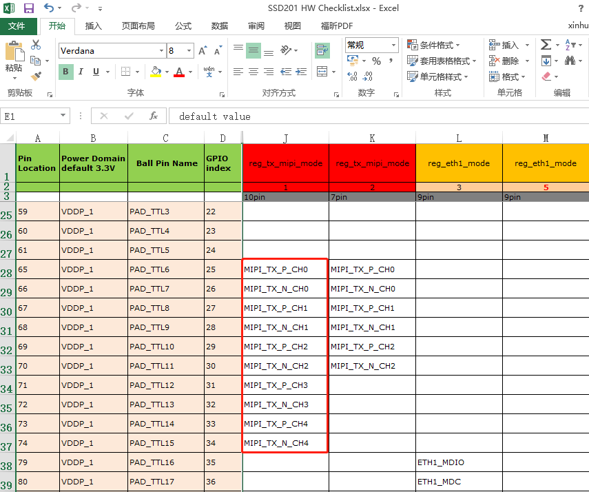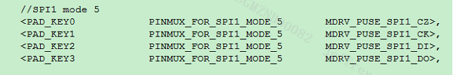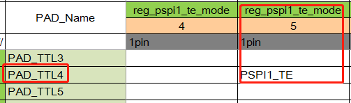 查询HW Checklist表格,找到管脚对应的复用模式。如下例,配置PAD_TTL0~PAD_TTL3为PSPI1_PL_MODE_4,配置PAD_TTL4为PSPI1_TE_MODE_5。