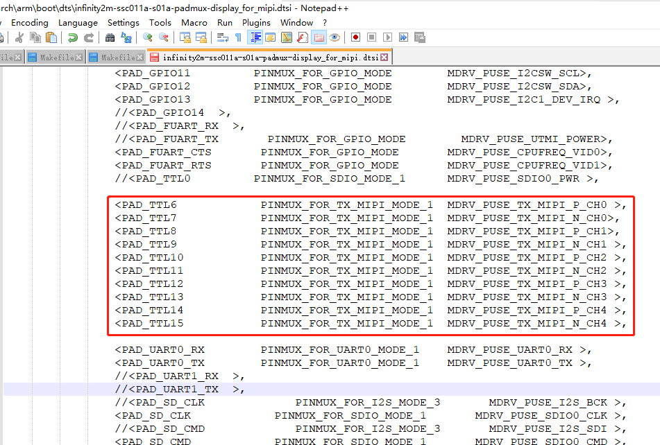 通过如上知道panel使用的是ttl24_mode_4,对应kernel的pioneer3-ssc020a-s01a-demo-camera-padmux.dtsi(使用的config不一样话对应的padmux.dtsi不一样)配置如下:
