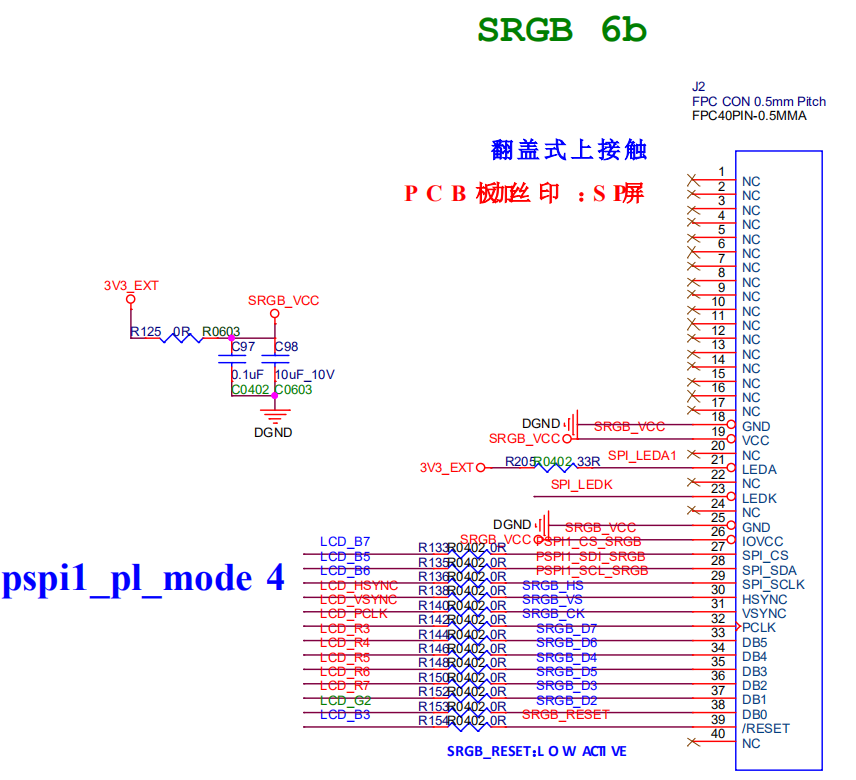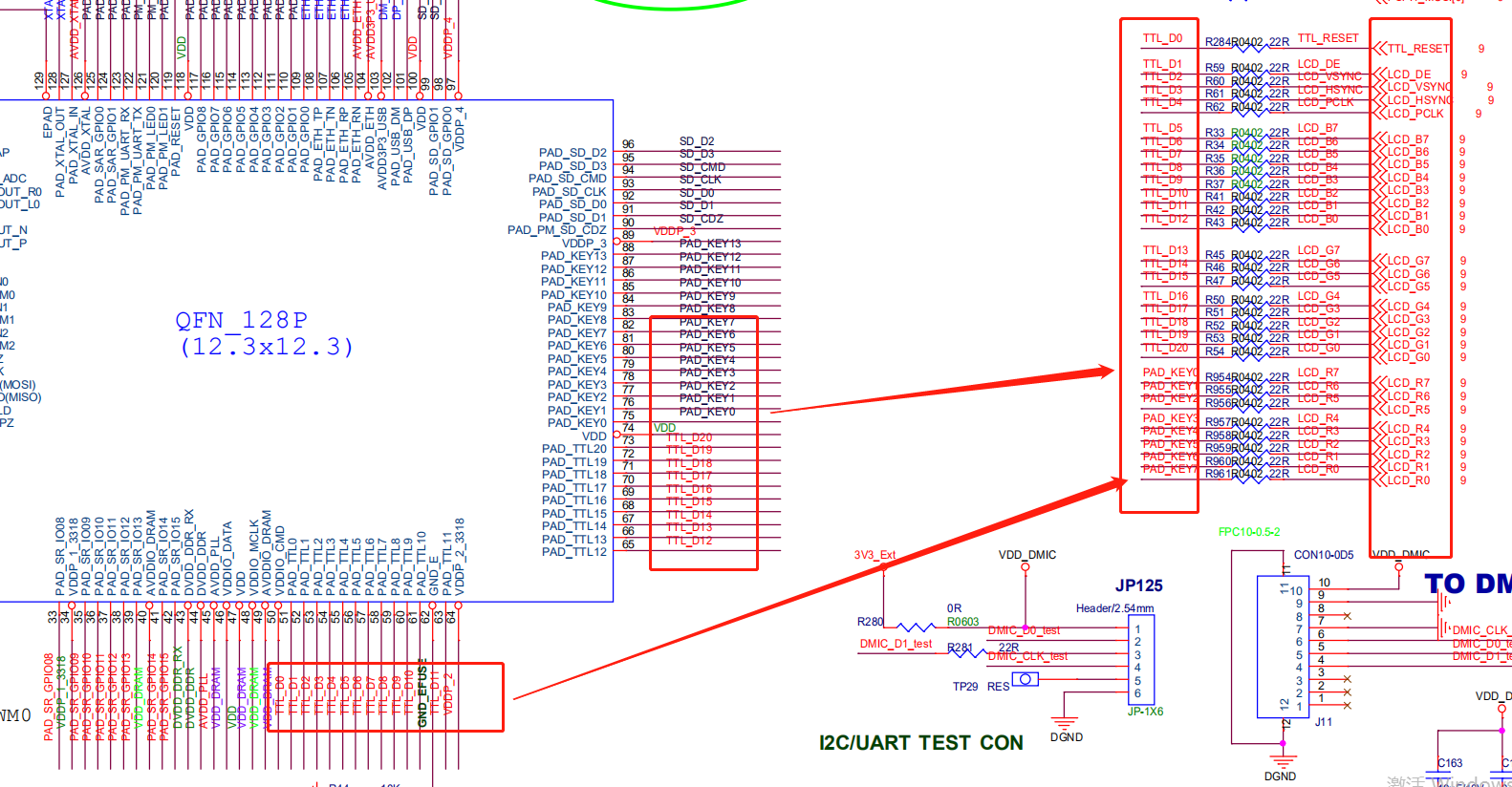 查看如下原理图可知RGB888数据格式,以及CLK/HSYNC/VSYNC/DE对应的Pin:
