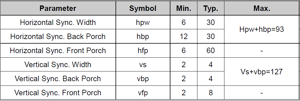 HTotal = u16Width + u16HSyncWidth + u16HSyncBackPorch + HSyncFrontPorch VTotal = u16Heigth + u16VSyncWidth + u16VSyncBackPorch + HVyncFrontPorch DCLK = HTotal * VTotal * FPS