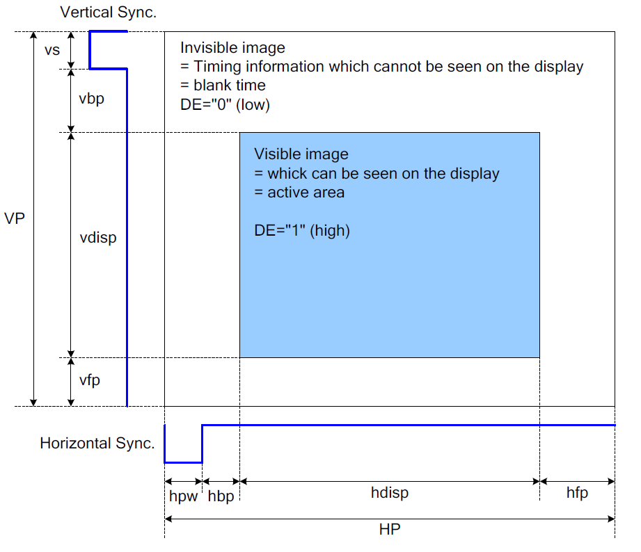 使用Parallel RGB Interface的panel需要HSYNC、VSYNC、DOTCLK来作为同步信号,RGB data只在timing的特定区间有效。