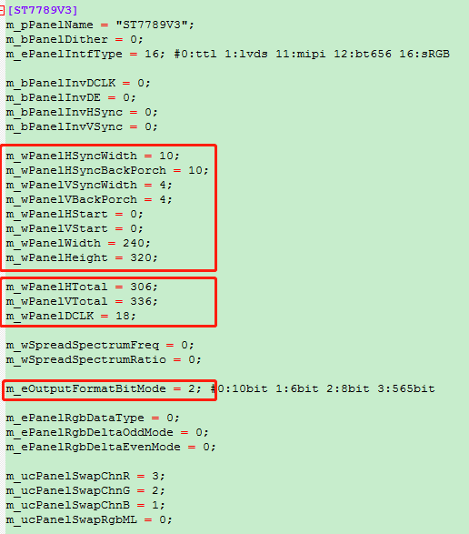 m_wPanelHTotal= m_wPanelHSyncWidth+m_wPanelHSyncBackPorch+m_wPanelWidth+HFP=10+10+240+46=306 m_wPanelVTotal=m_wPanelVSyncWidth+m_wPanelVBackPorch+m_wPanelHeight+VFP=4+4+320+8=336 m_wPanelDCLK= m_wPanelHTotal*3*m_wPanelVTotal*FPS=306*3*336*60=18MHz