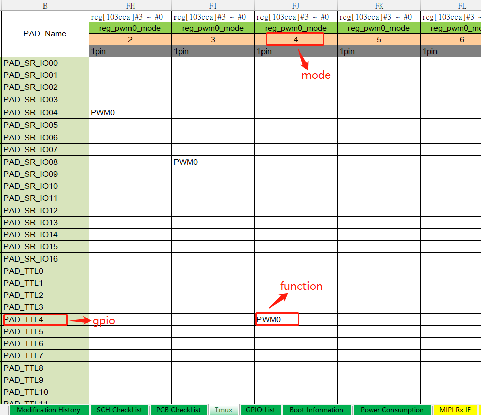 以PAD_TTL4配置成PINMUX_FOR_PWM0_MODE_4为例: