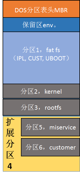 SD boot方案是只通过SD卡从rom启动到rootfs,即IPL, CUST, UBOOT, ENV, KERNEL, ROOTFS等image都存放在SD卡中。分区设计和image存放位置如下图所示:
