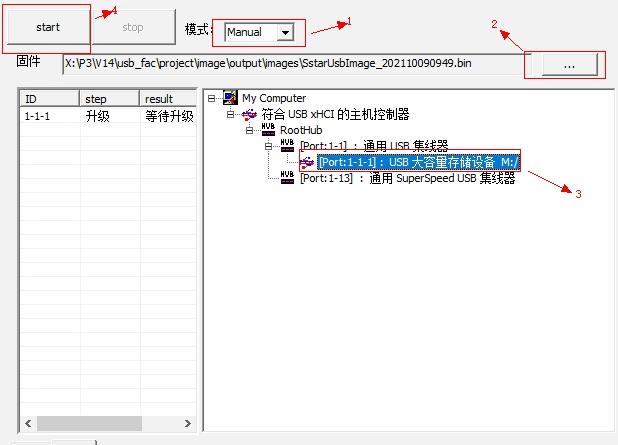 如果不想插入板子识别到设备后自动进行升级,可以选择manual模式,升级方式跟auto差不多,只是要在升级前选中需要升级的设备,然后再点击start进行升级: