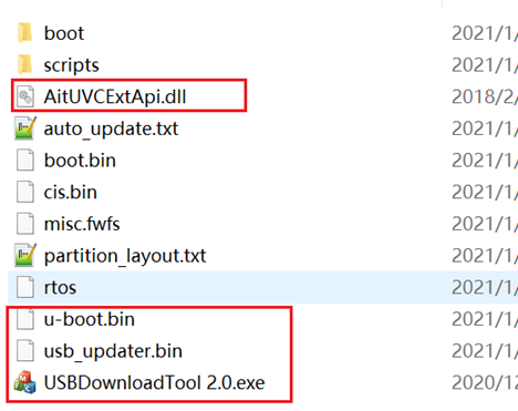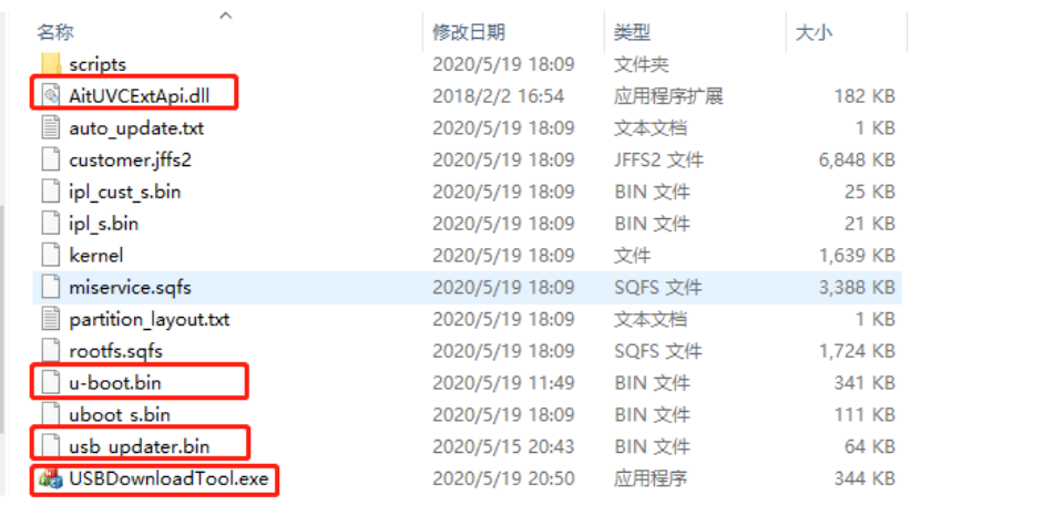 将usbdownload、bin、AitUVCExtApi.dll 和将要烧入的root.bin或env、kernel、rootfs.ramfs拷贝到同一目录下