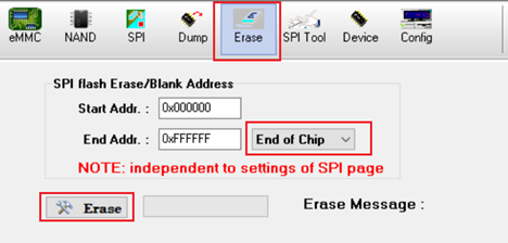 用isptool连接上,connect后,选择erase选项卡,选择end of chip,然后erase,如下图: