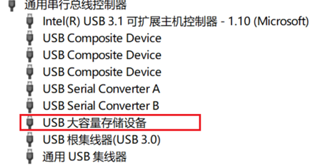 在flash erase成功后,断电重启,可以在设备管理器通用串行总线控制器选项中看到一个大容量存储设备,如下图: