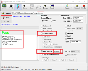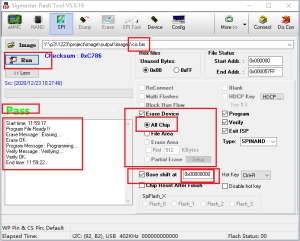 按如下红框的步骤,选择需要烧录cis.bin以及对应的flash地址(如下),然后点击run即可,烧录完成后工具显示pass表示已烧录成功。