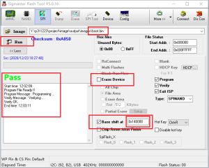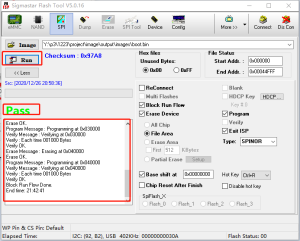 按如下红框的步骤,选择需要烧录boot.bin以及对应的flash地址(如下),然后点击run即可,烧录完成后工具显示pass表示已烧录成功。