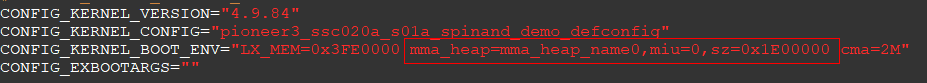 例打开dispcam_p3_spinand.glibc-9.1.0-s01a.64.qfn128.demo_defconfig配置文件,找到CONFIG_KERNEL_BOOT_ENV配置项,更改mma_heap=mma_heap_name0,miu=0,sz=0x1E00000参数中sz的size。