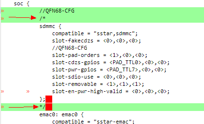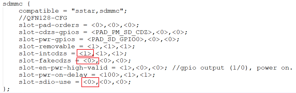 因为所用的dts中的sdmmc节点是针对sdio wifi配置出来的,需要对其进行下修改,修改后的配置如下: